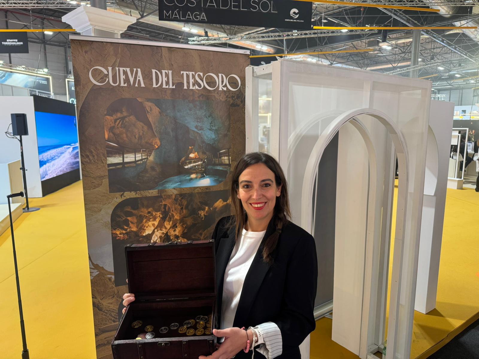 Esta historia se trasladó a FITUR mediante una cuidada escenografía que recreaba el ambiente de la cueva, con un cofre lleno de monedas, elementos visuales y roll-ups promocionales que conectaban emocionalmente al visitante con el patrimonio milenario del municipio.