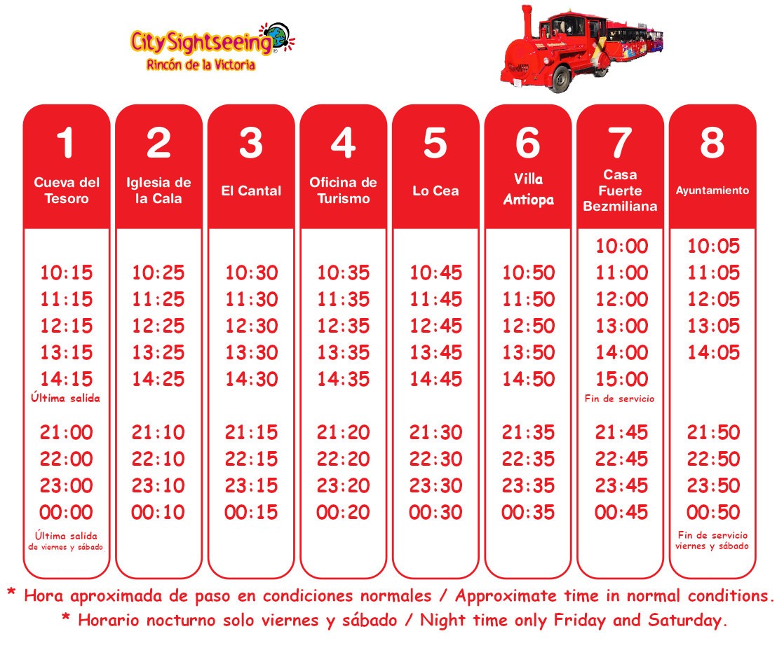A lo largo de ocho paradas situadas en zonas estratégicas del municipio, los viajeros pueden desplazarse entre la Iglesia de la Cala del Moral y la Villa Antiopa, recorriendo todo el litoral rinconero, con los siguientes horarios: de lunes a domingo: de 10:00 a 15:00 horas. Además, los viernes y sábados, estará de 20:00 a 01:00 horas.