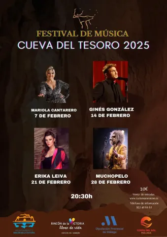 Rincón de la Victoria presenta una nueva edición del Festival de Música Cueva del Tesoro, que se celebrará del 7 al 28 de febrero. Mariola Cantarero, Ginés González, Erika Leiva y Muchopelo se darán cita los días 7, 14, 21 y 28 de febrero a las 20:30 horas, en la cavidad rinconera