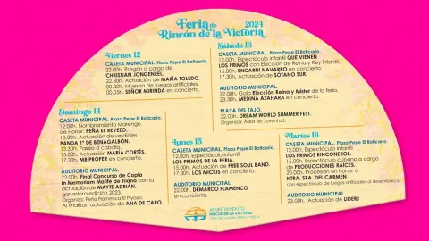 La Feria de Rincón de la Victoria 2024, en honor a la Virgen del Carmen, se celebrará del 12 al 16 de julio con importantes novedades y un mayor protagonismo de la feria de día. Se instalará una caseta municipal en la plaza Pepe El Boticario donde habrá una amplia programación para todos los públicos. El pregón se celebrará el viernes 12 de julio a las 22:00 horas a cargo del nadador de aguas abiertas e impulsor de Brazadas Solidarias, Christian Jongeneel.