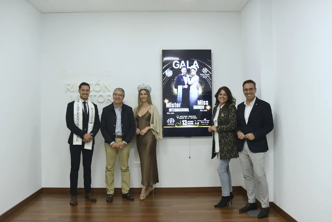 El alcalde de Rincón de la Victoria, Francisco Salado, el concejal de Turismo, Antonio José Martín, la concejala de Cultura, Feria y Fiestas, Paz Couto, junto al actual Míster Internacional Málaga, Alejandro Reina, y Miss Mundo Málaga, Angélica Fernández, han sido los encargados de anunciar la gala que se llevará a cabo en el Auditorio Municipal a partir de las 21:30 horas de acceso libre.