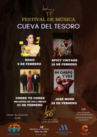 El Festival de Música Cueva del Tesoro cobra este año mayor importancia al celebrarse en el marco del 50 aniversario de la apertura turística de la cavidad. Los conciertos serán los viernes 9, 16 y 23 de febrero y el miércoles 28 de febrero a las 20:30 horas. El precio de la entrada es de 10 euros y puede adquirirse en el portal turístico de Rincón de la Victoria: Adquirir entradasCuatro conciertos, con cuatro estilos muy diferenciados, que abarcarán a todos los públicos y que “harán de esta edición una de las más importantes por el nivel de los participantes”, explicó el concejal de Turismo, Antonio José Martín (PP).